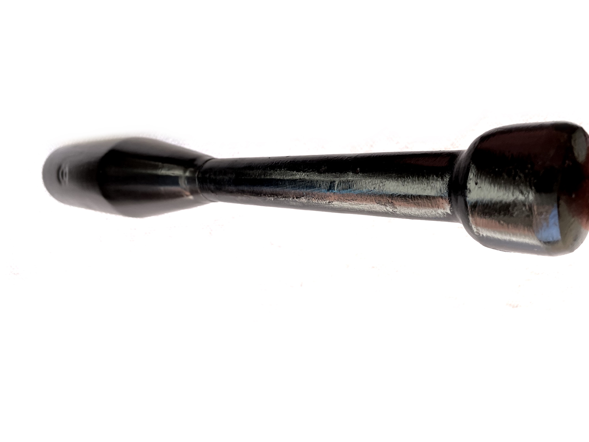 Feito em aço e tem um revestimento vulcanizado PVC em preto na ponta pesada. O punho com 2,3 cm de espessura é em ferro sem revestimento propositalmente, para criar uma boa aderência na pegada, ser seguro e firme em suas mãos a ponta leve é mais larga 4 cm para não escape da mão durante os movimentos.