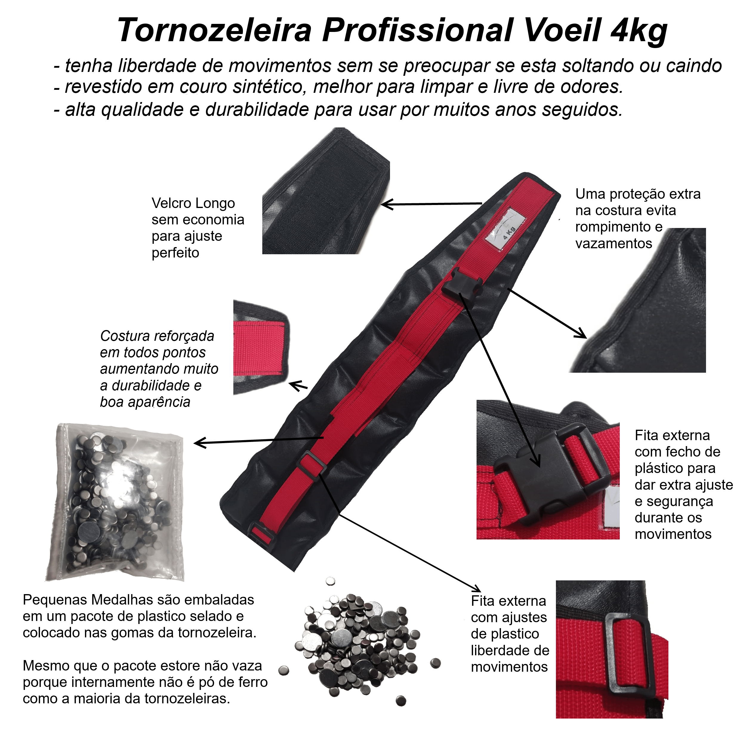 O peso é composto por pequenas medalhas de ferro e não areia ou pó de ferro que podem vazar com o tempo de uso e após vários impactos do uso constante.